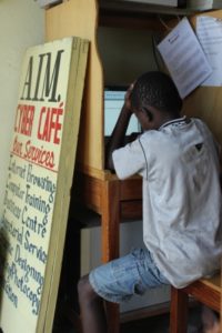 Wir drucken für Komendas Schulen! Kein Internet bedeutet nicht, dass im AIM. Cybercafe nichts passiert. Wochentags steht das AIM Cybercafé offen für alltägliche Büroarbeiten. So werden hier Dokumente gedruckt, kopiert und digitalisiert. Beispielsweise wurden die Examen einer privaten Junior High-School in Komenda von AIM. Mitarbeitern digitalisiert, gelayoutet und gedruckt, um den Schülern saubere und gut leserliche Abschlussarbeiten vorlegen zu können. Bei dieser Großaktion wurde AIM. darauf aufmerksam, dass einer der Cybercafe Mitarbeiter in die eigene Tasche gearbeitet hat. AIM. bedauert sehr, dass daraufhin keine weitere Zusammenarbeit mehr möglich sein wird. Neues Personal wird derzeit geschult und langsam eingearbeitet.