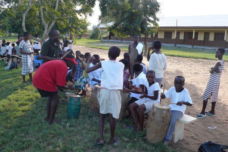 Reichlich Trommeln von beiden Jugendclubs und ein Partyanimateur in der Gestalt von Solomon Appiah, unserem Projektmanager, der besser entertaint, als jedes Cheerleader -Team (und der laut seiner Aussage leider kein Fußball spielen konnte, da Ballack ihm seine persönlichen Schuhe nicht mitgebracht hatte) brachten also für etwa 2 Stunden eine super Party in die Nähe des Komenda Fußballfeldes.