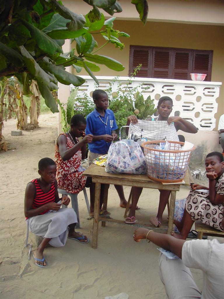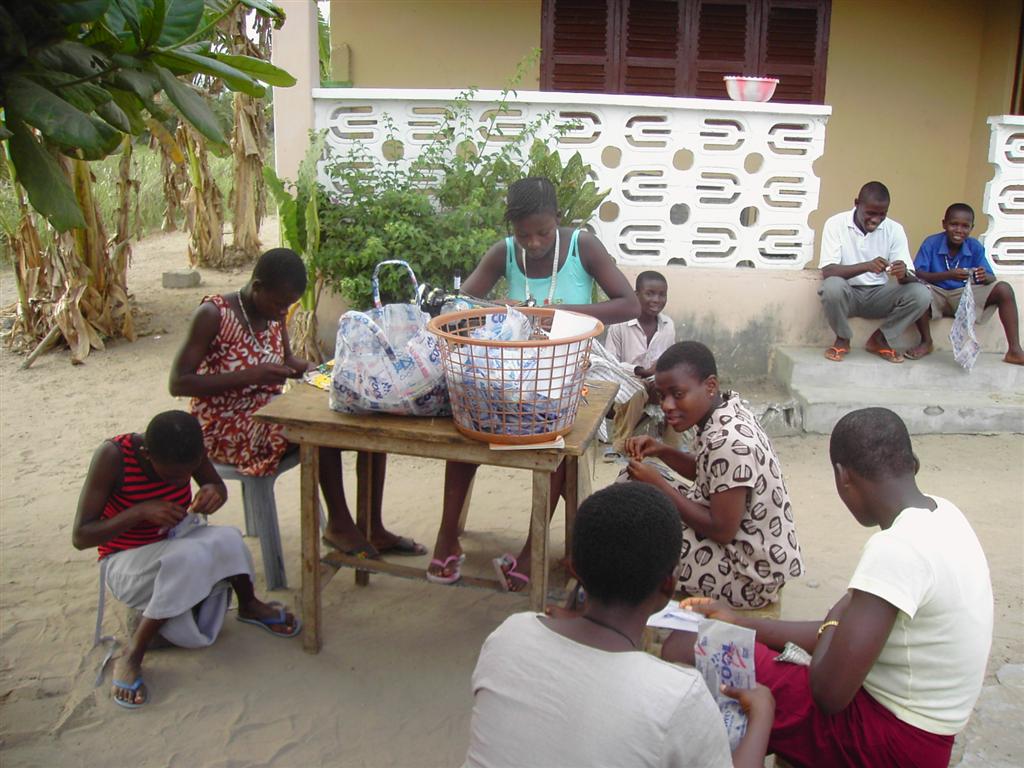 Am Donnerstag nachmittag wurden weitere praktische Tragetaschen aus alten Wassertüten hergestellt. Die Teilnehmer des Näh-workshops werden geschickter im Umgang mit Nadel und Faden, und werden sicher noch viele Taschen herstellen. So wird diese Idee der Müllverwertung in Komenda Verbreitung finden.