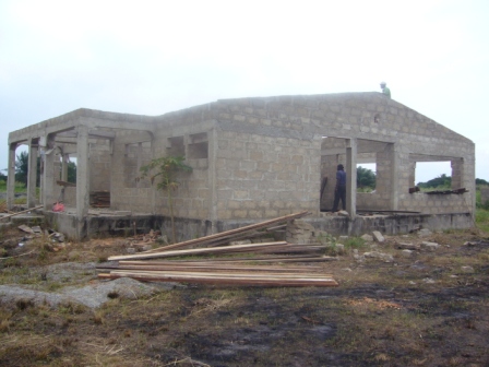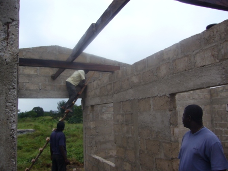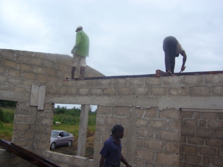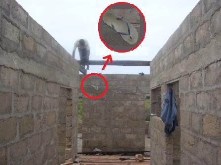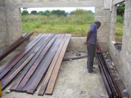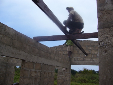Tag 1, Blog 2: Bis in den spaeten Abend waren die Zimmermaenner am Werk. Nachdem das Saegen der Holzlatten vorerst vollendet war, wurde das Holz behandelt und gestrichen. Einzele Holzlatten wurden bereits aneinander genagelt und das Dachgeruest vorbereitet. Eine netter Schnappschuss: Einer der Zimmermaenner verliert in der Hoehe seine Badelatsche.