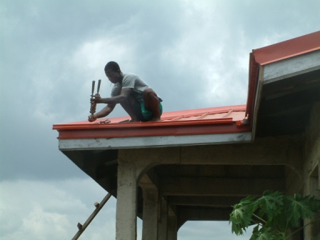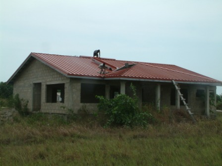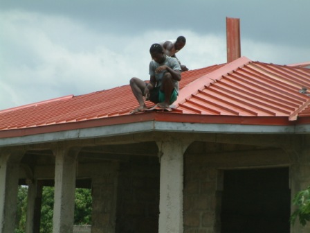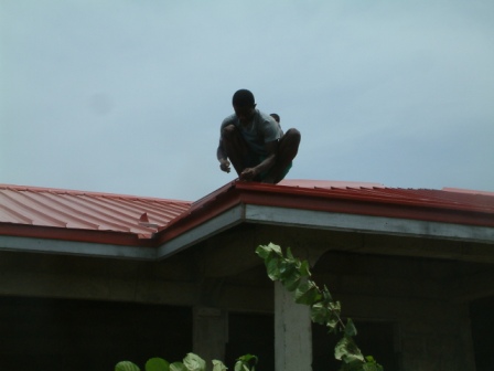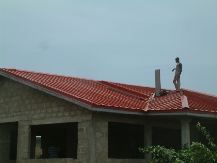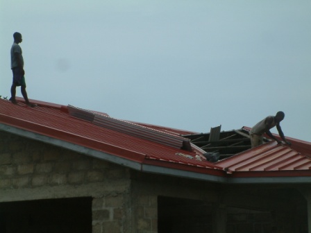 Seit heute früh sind die Dacharbeiter wieder am werkeln. Die letzten Kleinteile wurden noch in der Nacht nach Komenda geliefert. Ein kleines Stückchen Dach muss noch gemacht werden, und dann fehlen nur noch ein paar Abdeckungen.