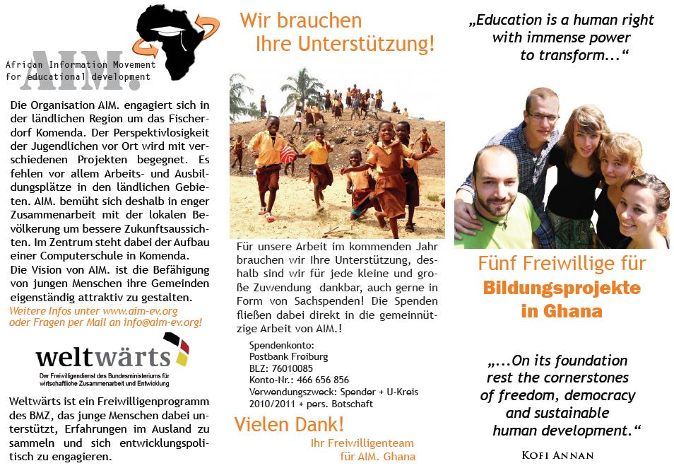Bereits am Freitag wurden wir dem Jugendclub in Ayensudo vorgestellt; auch da wurden wir, wie überall in Ghana, freundlich empfangen und können es kaum abwarten die Arbeit mit den Jugendlichen zu starten. Da der Schwerpunkt der AIM. Aktivitäten bis jetzt meistens auf dem Jugendclub in Komenda lag, sollen in den kommenden 12 Monaten die Angebote für die Jugendlichen in Ayendsudo ebenfalls deutlich verstärkt werden, um den Wirkungsbereich von AIM. weiter zu vergrößern.
