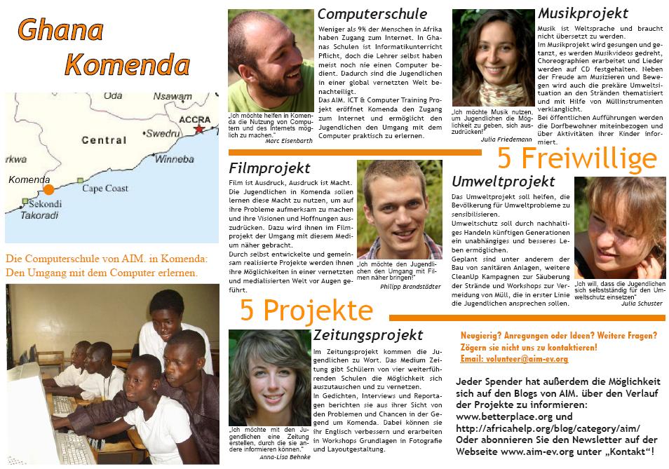 Wir, das sind die fünf neuen Freiwilligen, die fünf bestehende Projekte übernehmen. Für einen kurzen Überblick, wer wir genau sind, wie wir aussehen und wer welches Projekt betreut, könnt ihr anbei unseren Spendenflyer ansehen.