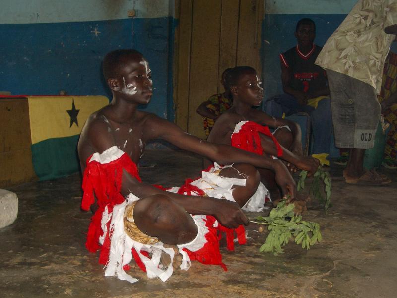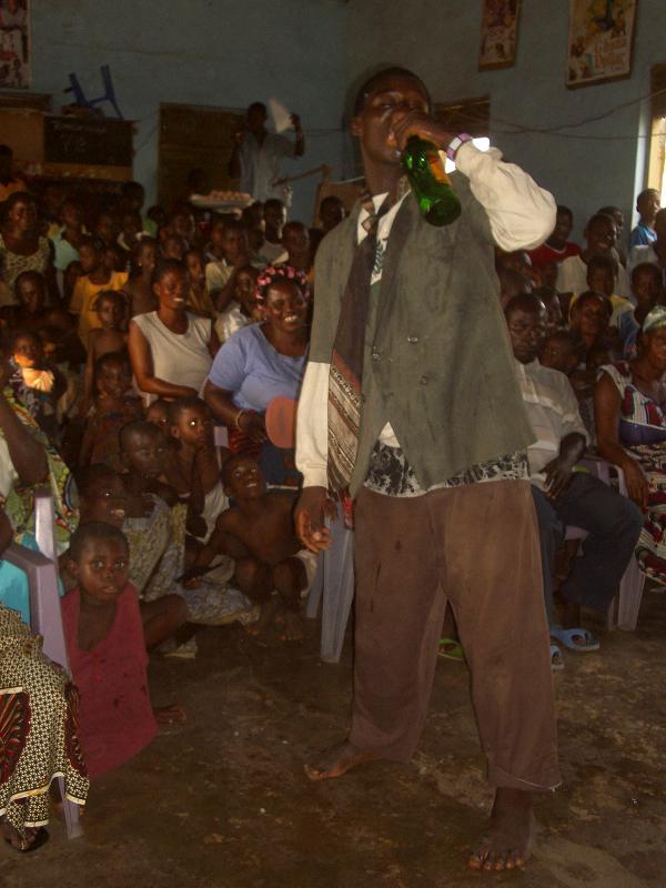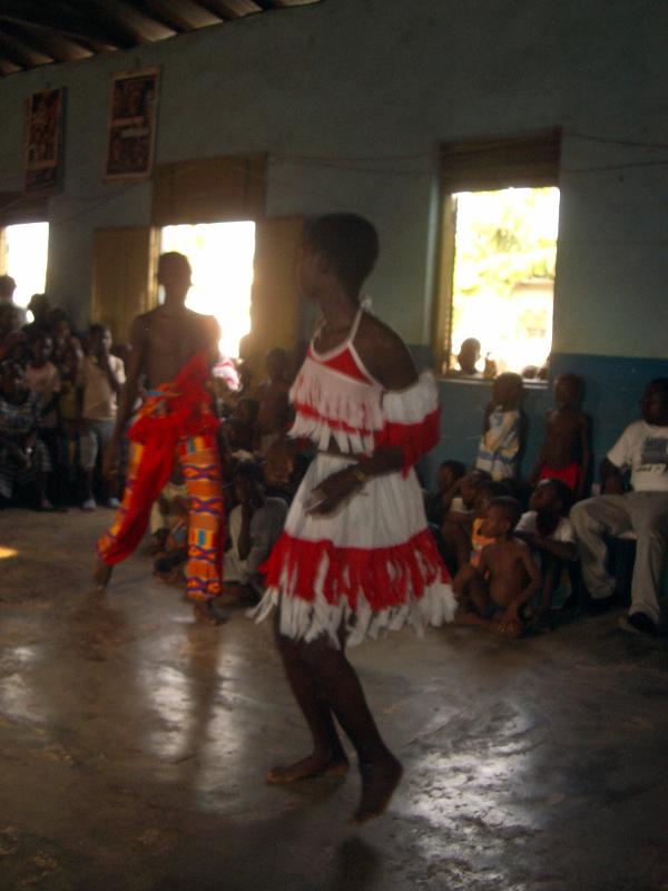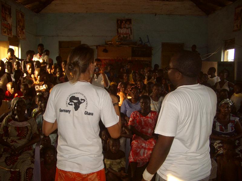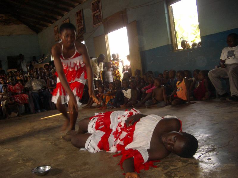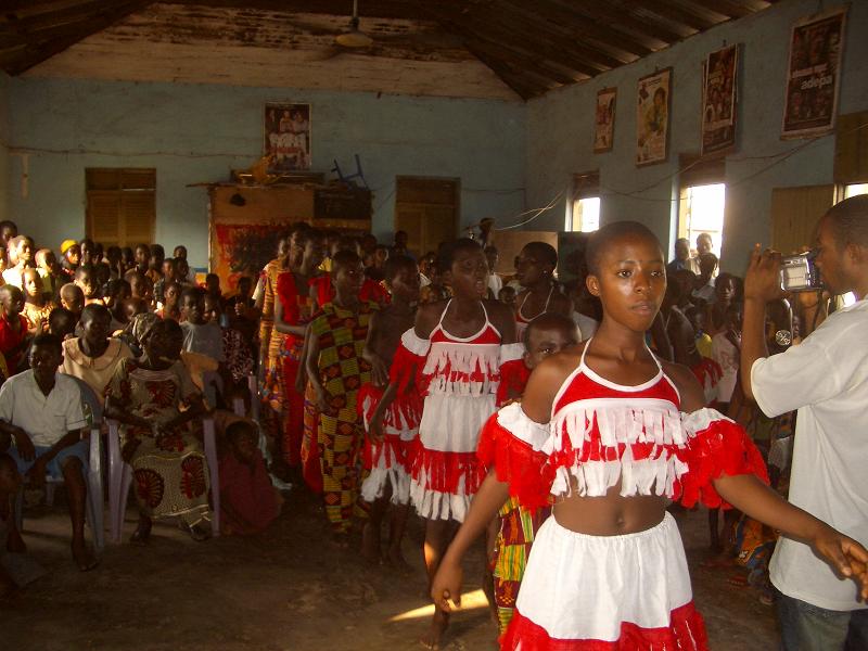 Einer nach dem anderen kam zu mir, fragte, was wir nun machen sollen? Ich beauftragte Theophilus, die Leute mit einem Spiel zu unterhalten, was er auch tat. Dann fingen die inzwischen vollzähligen Youth Club Member als Lückenfüller an zu tanzen. Dank Solomons Organisation hatten wir sogar Kostüme. Nach und nach trudelten noch ein paar Eltern ein. Wir konnten nicht mehr länger auf Solomon warten. Kurz nach halb vier begrüßte unser wieder aufgetauchter Cultur Workshopleiter Isaac die Anwesenden. Während dem ersten Programmpunkt tauchte nun auch Solomon auf. Seine Hand war verbunden aber ansonsten war ihm nichts schlimmes passiert. So konnten wir unser Programm doch noch nach Plan durchführen. Knappe 10 von 35 Eltern waren letztendlich da, immerhin! Auch wenn ich zu fertig war, um die Aufführung zu geniessen, wurde doch viel gelacht. Solomon und ich berichteten ueber AIM., über den Youth Club, unsere Aktivitäten und die bevorstehende Einweihungsfeier. Die Anwesenden hörten interessiert zu. Wäre ich selber erst um halb vier aufgetaucht und hätte den ganzen vorherigen Stress nicht gehabt, wäre ich sicher zufrieden gewesen! In Ghana bedarf es an unendlichem Durchhaltevermögen, gewaltigem Einsatz und grosser Geduld um ein einfaches Ereignis auch umsetzen zu koennen. Und doch würde ich unsere Bemühungen nicht als verschenkte Zeit bezeichnen. Jegliche Aufführung bringt Bewegung in unsere Jugendlichen, schweisst die AIM. Mitglieder zusammen und gerade diese Aufführung in der Town Hall mit all ihren Schwierigkeiten hat uns gezeigt, wie viel noch zu tun ist, bis unsere Einweihung ein gelingendes Ereignis werden kann.