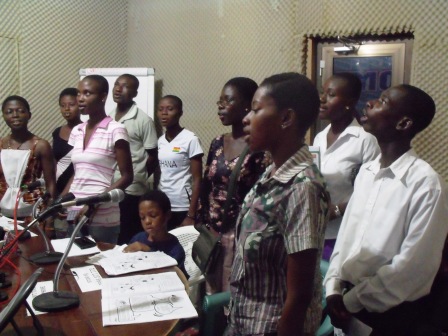 Als Abschluss und Höhepunkt hatten die Jugendlichen die Moeglichkeit, das Projekt beim Radiosender „Ahomka FM“vorzustellen. Dort hatten wir eine Stunde „Air time“. Yeah! Die Schüler haben das Projekt praesentiert, Artikel aus der Zeitung, Gedichte, Witze und Rätsel vorgelesen und zwei Mädels haben Gospel gesungen, die bei allen Gänsehaut erzeugt haben. Wir waren sehr stolz auf die Jugendlichen, eine richtig gute Show!