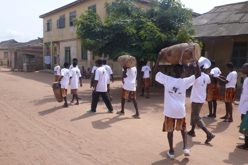 Am Ostersonntag wartete eine kleine Überraschung auf die Jugendclubmitglieder: Sie durften neue Trommeln ihr Eigen nennen! Seit längerem hatten wir nun schon die Anschaffung eines neuen „Trommelsets“ geplant, doch hatten dies aufgrund von mangelnden Fachkenntnissen immer wieder aufgeschoben. Letzte Woche Sonntag war es dann endlich so weit: Aufgrund einer geplanten Veranstaltung (siehe „Durbar Performances“) war die Anschaffung überfällig geworden und ich und zwei andere Jugendclubmitglieder begaben sich in aller Frühe am Ostersonntag in ein 2 Stunden entferntes Dorf, um dort von einem Trommelspezialisten die Trommeln in Empfang zu nehmen. Drei „Palongo-Trommeln“ sind es; typische ghanaische Trommeln, die in vielen traditionellen ghanaischen Rhythmen Gebrauch finden, und der Jugendclub-Culture-Group (Culture = „Trommeln und Tanzen“) so eine vielfältige Grundlage bieten.