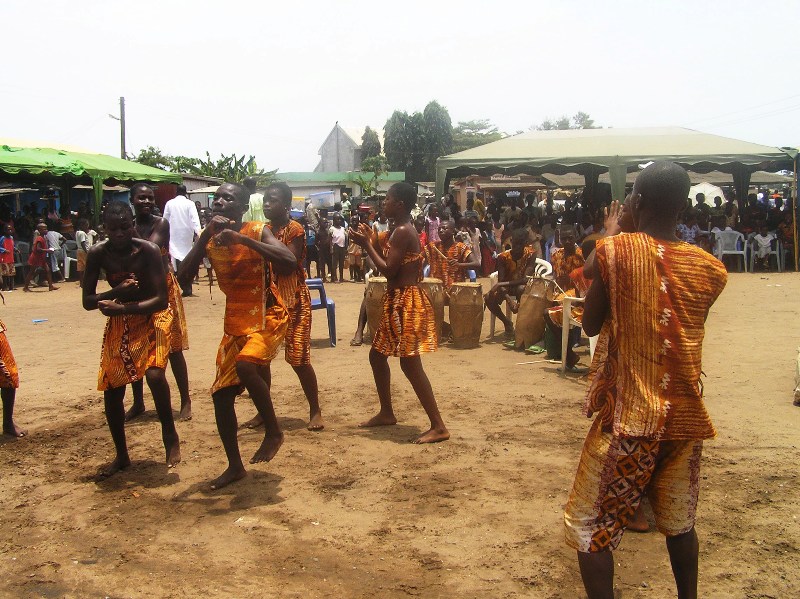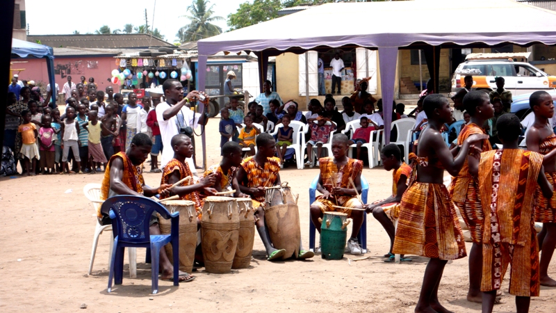 Am Ostermontag früh ging es dann zur „Lorry-Station“ (der Taxistation in Komenda), die anlässlich der Veranstaltung zu einer Bühne umgestaltet wurde. Mit etwas Verspätung seitens der eingeladenen „Big Men“ (dem Chief und dem Regionalminister) ging es dann los mit den „Cultural Performances“; abgesehen von den einstudierten Tänzen legten die Jugendlichen noch ein paar Improvisationen hin und umtanzten die Big Men bei Ihrer Ankunft.