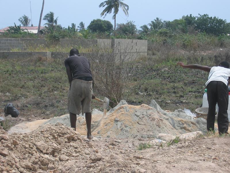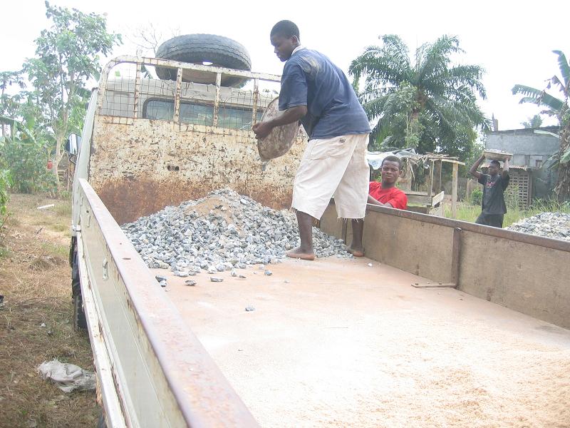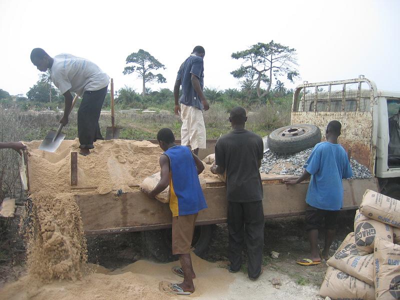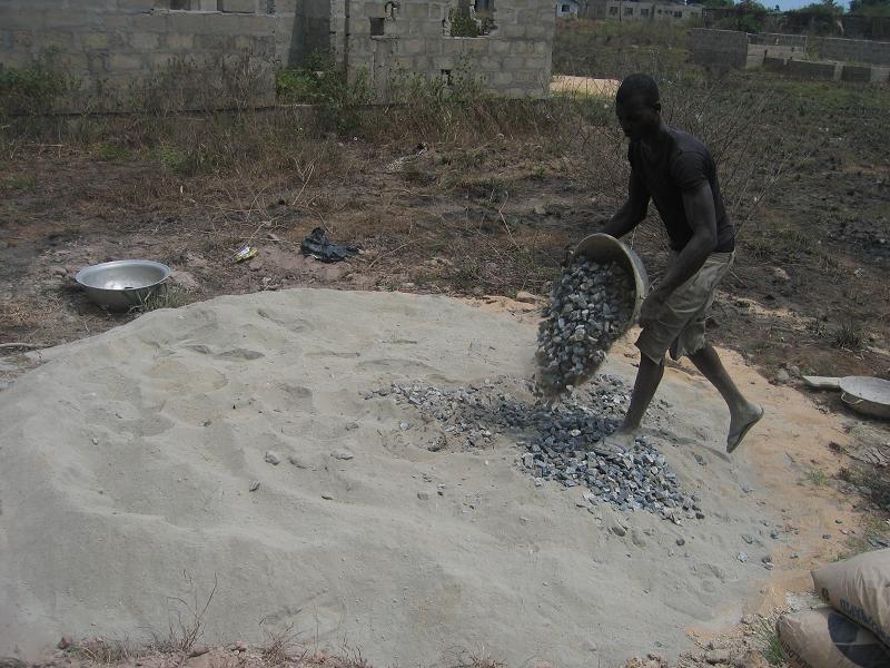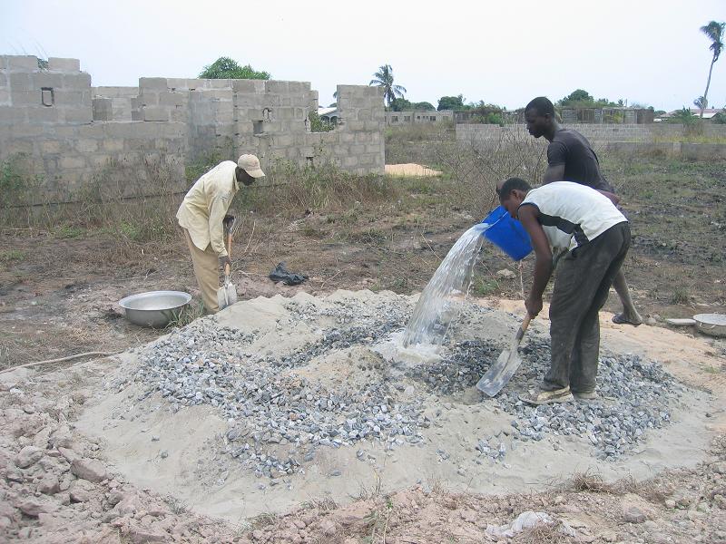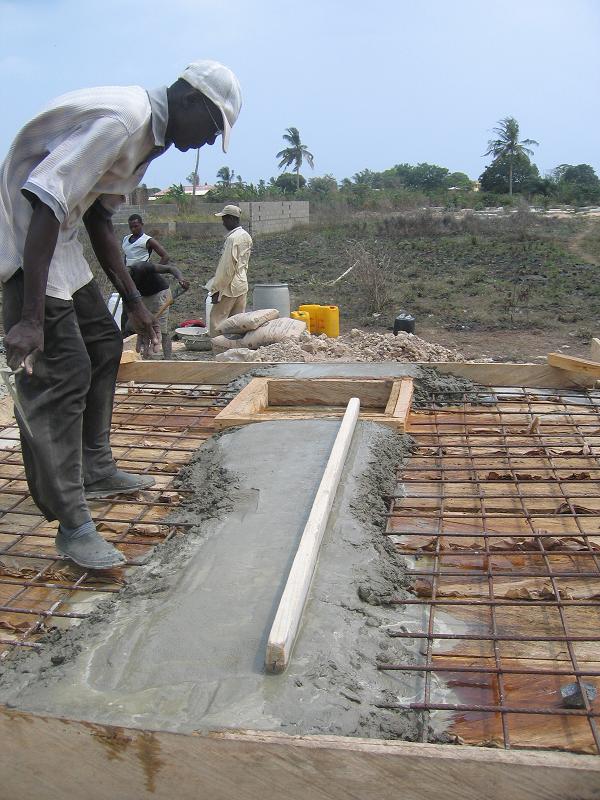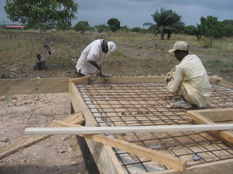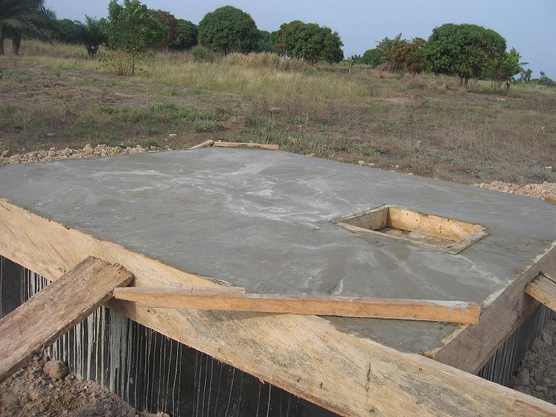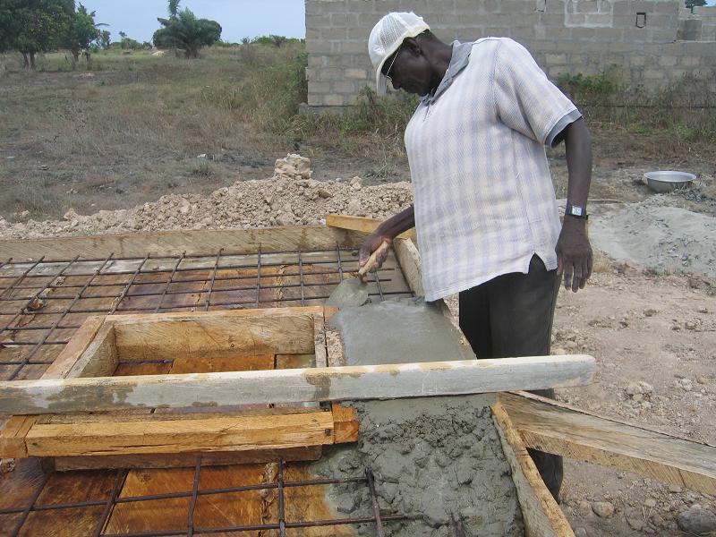 Die Renovierung ist so gut wie abgeschlossen. Am Dienstag wurden die notwendigen Baumaterialien für den letzten Schritt, die Abdeckung des Reservoirs; auf das Land gebracht. Der Beton (Zement, Sand, Steine und Wasser) wurde zusammengestellt und in die Verschalung gegossen. Mr. Arko, der Bauchef von Komenda, gewährleistete mit seiner persönlichen Arbeitskraft die Qualität der Abdeckung. Nun muss die Mischung noch zwei Wochen trocknen, bevor der Schreiner die verschalung wieder entfernen kann und wir den Deckel auf Stabilität testen können.