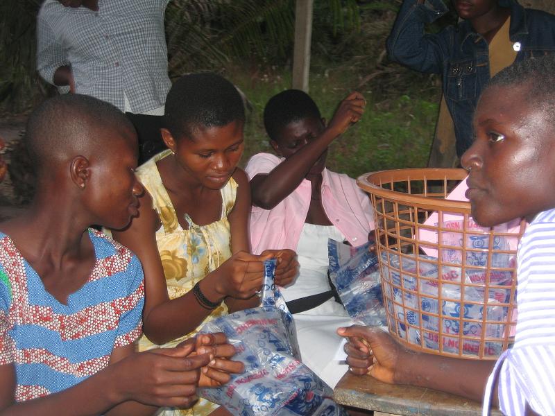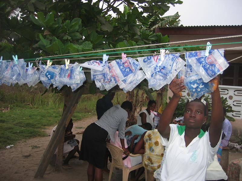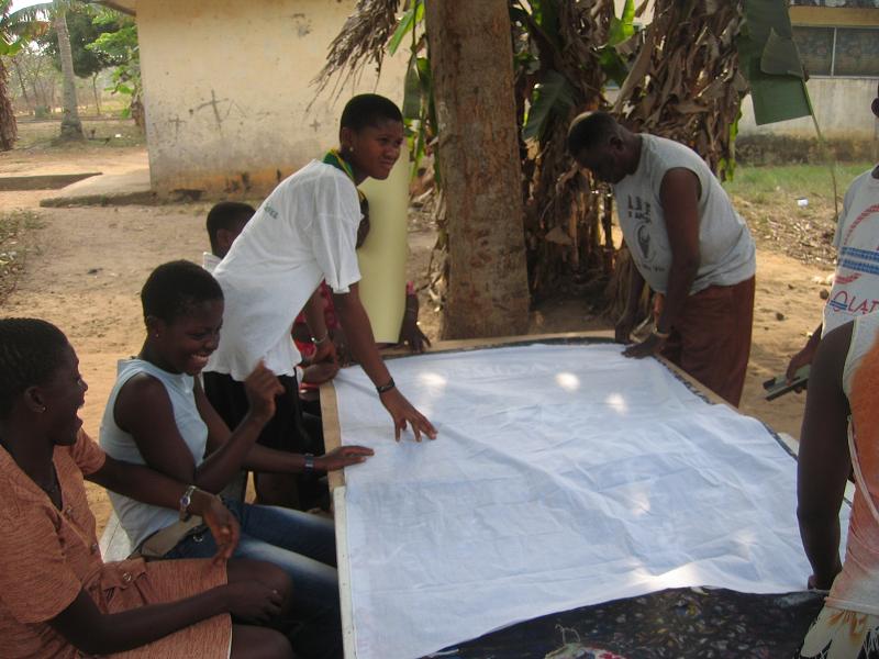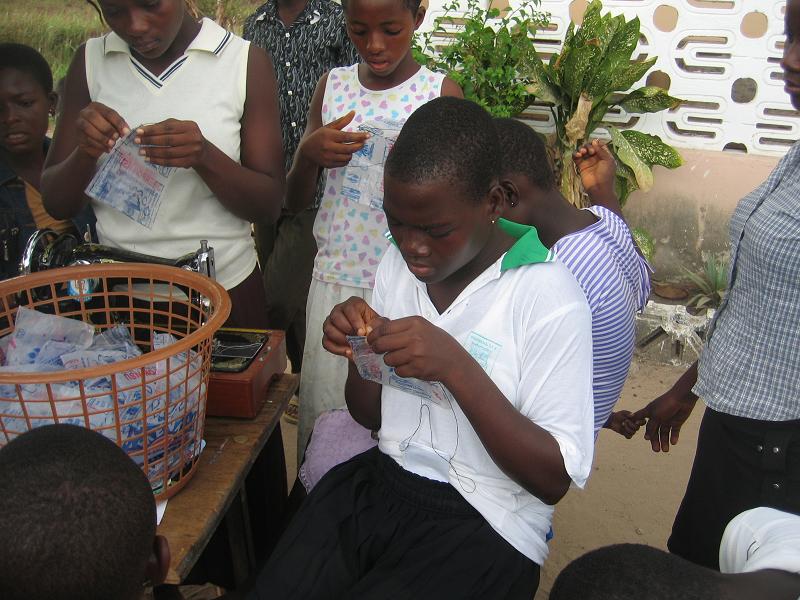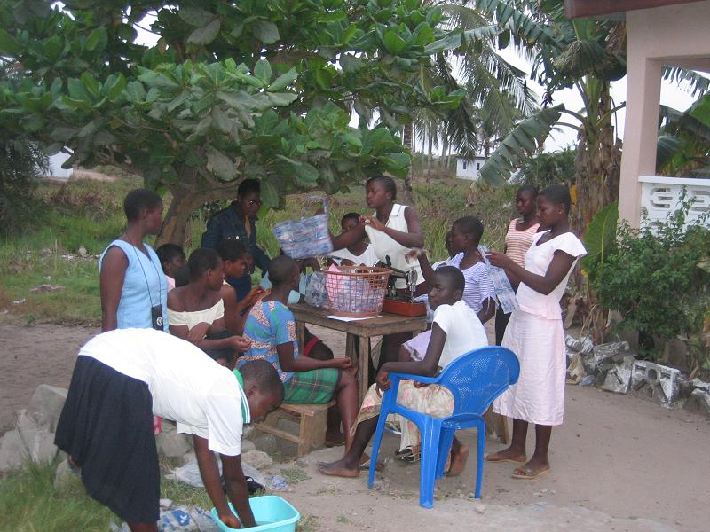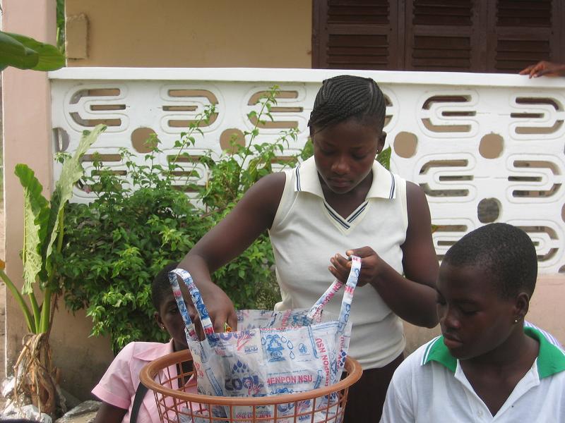 Wie berichtet haben diese Woche die ersten Workshops des Jugendclubs begonnen. Graphik Design am Dienstag war noch recht dürftig besucht. Am nächsten Tag machten die Schüler dies jedoch wieder gut, organisierten sich selbst und besuchten den Graphiklehrer um ihre Arbeit vom Vortag zu beenden. So hat der AIM. Youth Club seinen ersten eigenen Banner. Wir sind hoch erfreut ;). Am Donnerstag trafen sich die Teilnehmer des Workshops „Nähen“. Hierbei geht es hauptsächlich um die Herstellung von „nsu bags“. Nsu heißt in der einheimischen Sprache (Fante) Wasser. An jeder Ecke kann ein kleine Plastiktüte mit Wasser gekauft werden. Leider schmeißt ein jeder dieses kleine Plastikding weg, egal wohin. AIM. in Ghana sammelt seit einiger Zeit die Tüten und hat ein eigenes Pfandsystem eingeführt, um den Müll in Komenda ein wenig einzugrenzen. Die Frage jedoch stets: Was tun mit den leeren Wassertüten? Nun haben wir die Antwort gefunden: Wir nähen Taschen. Sieht schick auch, und kommt gut an. Zusätzlich werden mit Stoff Botschaften auf die Taschen gestickt, wie zum Beispiel „Kepp Komenda clean“, „Ghana @ 50“ und „AIM. Youth Club“. Anschließend wird der Jugendclub die Taschen verkaufen und verdient damit sein erstes Geld für die Durchführung eigener Aktionen.