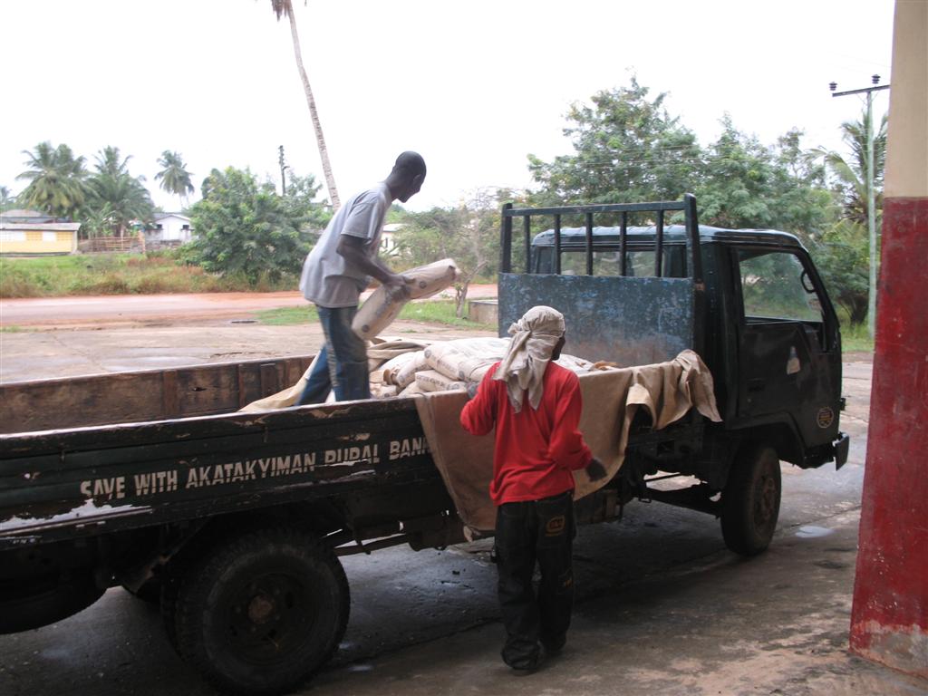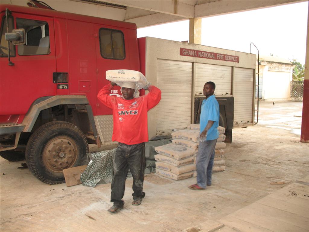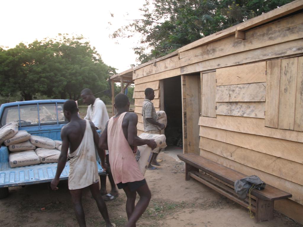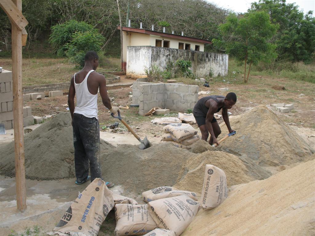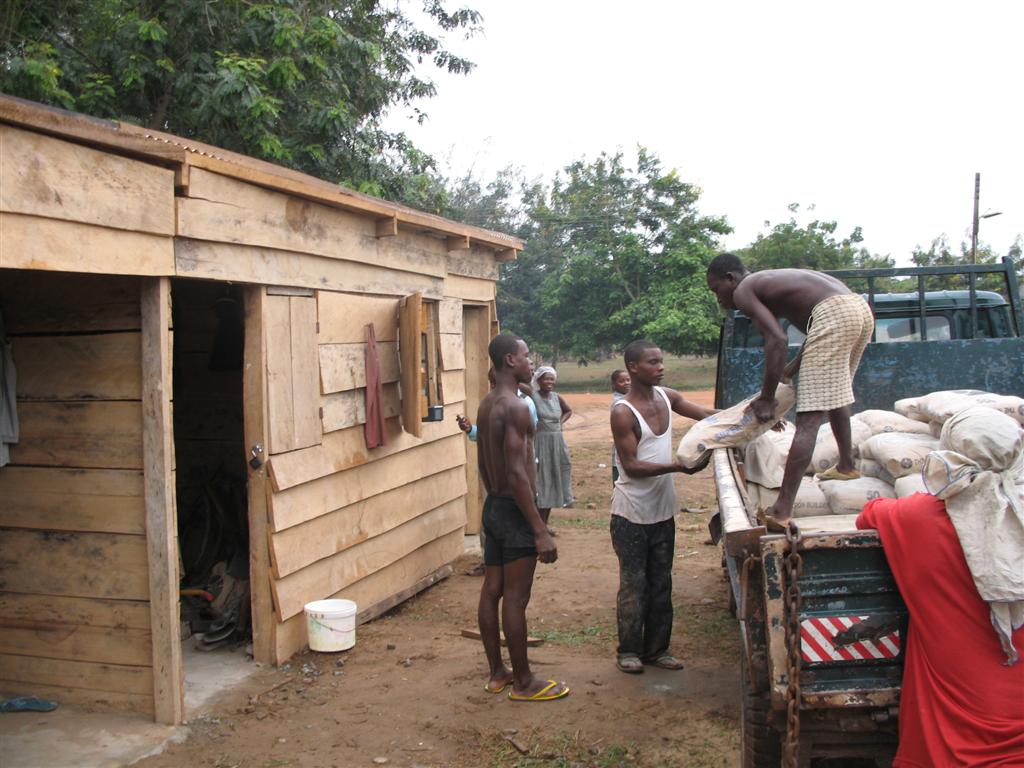 Hinzu kommt, dass wir Opfer der ghanaweiten Zementknappheit geworden sind. So wurde unser bereits gekaufter, jedoch zwecks der Lagerung im Geschäft gelassener Zement, einfach ein zweites Mal verkauft. Nun, die wichtigste Zutat beim Mixen und Pressen von vernünftigen Blocks ist Zement, also, was tun? Durch Insiderwissen erfuhren wir von einem kleinen Geschäft in einem Nachbarort, welches in der Nacht eine LKW-ladung voller Zement bekommen sollte. Also in einer Nacht und Nebel Aktion nach Ayensudo gedüst – der Insider sollte Recht behalten, es gab Zement – und sich mit harten Mitteln 30 Säcke Zement gesichert, die am nächsten Morgen um 5 Uhr auch zur Abholung noch bereit lagen.