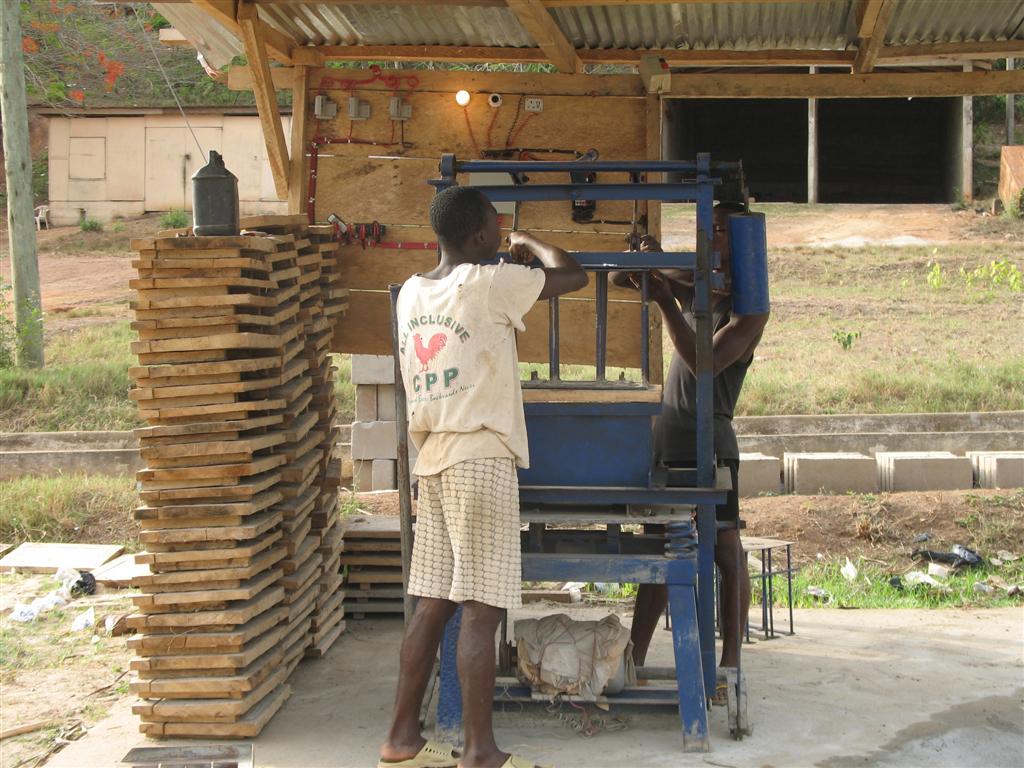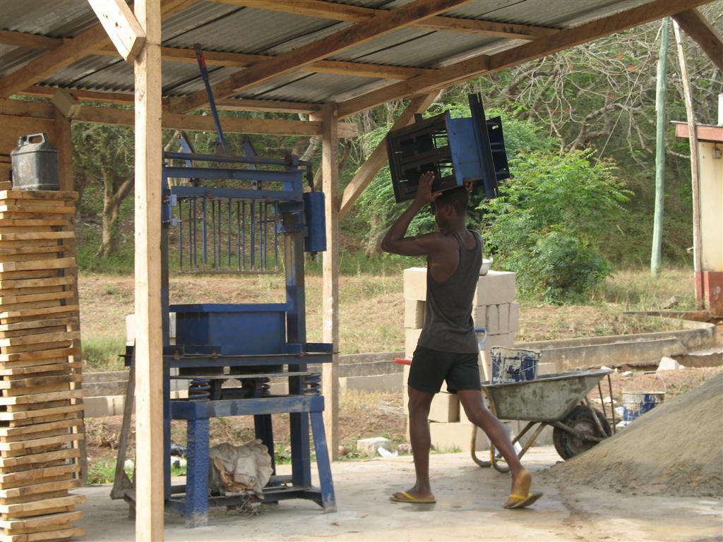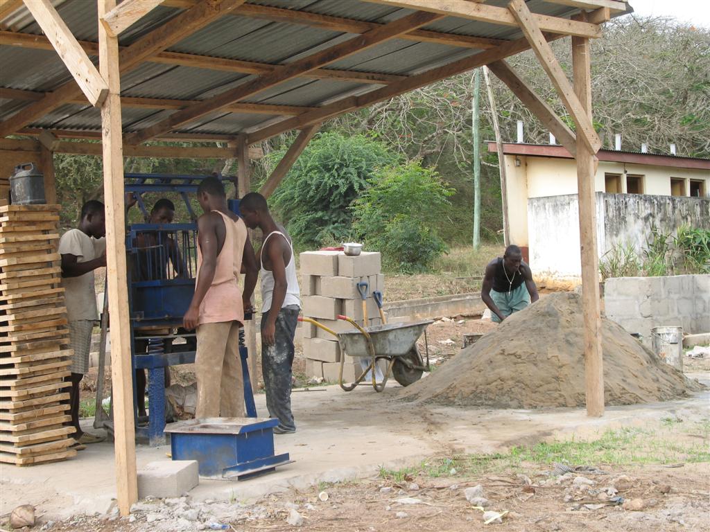ES GEHT LOS. Heute früh wurden die ersten AIM. – Blöcke gepresst. Dies ist der Auftakt für die Fundamentlegung des AIM. – computer-training centre. An dieser Stelle herzlichen Dank allen Unterstützern, die dies möglich gemacht haben. Am Nachmittag traf auch der restliche benötigte Zement ein. Die nächsten vier Tage werden 1500 Blöcke gepresst, dabei wird am Samstag und Sonntag ebenfalls gearbeitet. Schaffe, schaffe ..